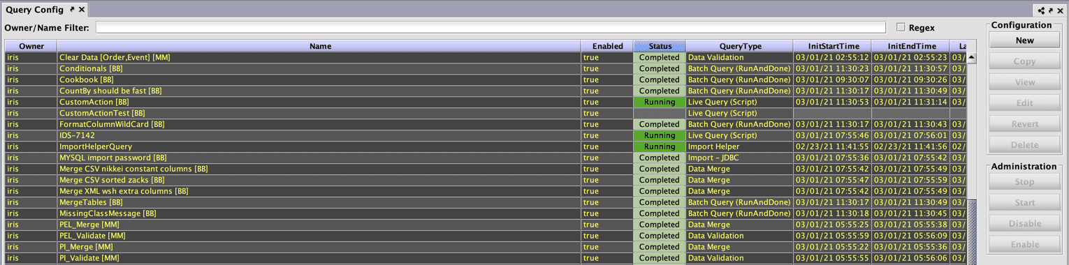 The Query Config button in the Deephaven console opens the Query Configuration window, which contains information about all of the Persistent Queries you are authorized to view in Deephaven with, as well as options to create and manage queries. Persistent queries operate just like console-based queries. However, persistent queries are created and saved, thereby enabling the automation of repetitive and/or timed operations. Also, persistent queries can be shared with other individuals or teams.