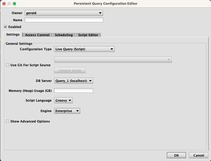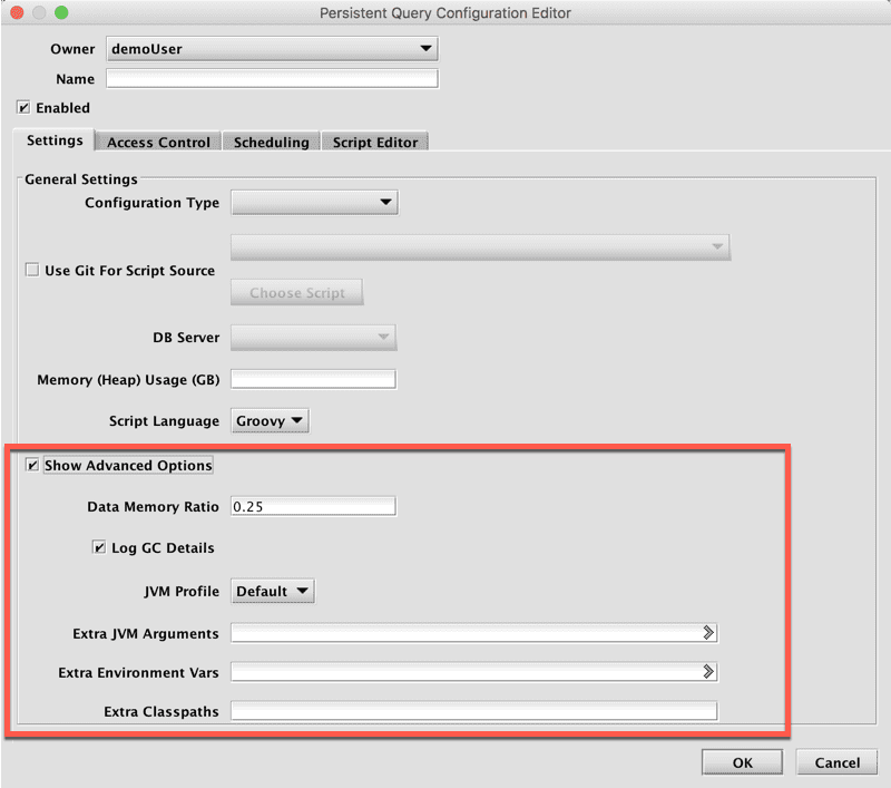 When creating a new persistent query, you will need, at a minimum, to provide a query name, select the configuration type and the DB Server, and ascribe memory. The remaining query settings, features and scripting will vary, based on the type of analysis you want to run in this query.