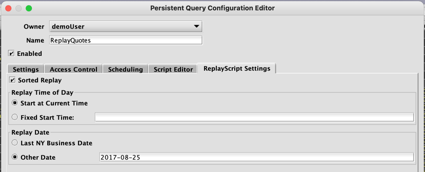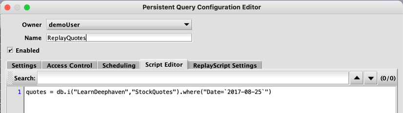 - Live Query Replay - (ReplayScript) scripts are configured to replay historical data the same as it was received when it was live, ticking data. For instance, if the price of a certain security changed dramatically during a specific period in the past, you could create a Live Query Replay - (ReplayScript) script that would re-run that period's price activity as if it were live.