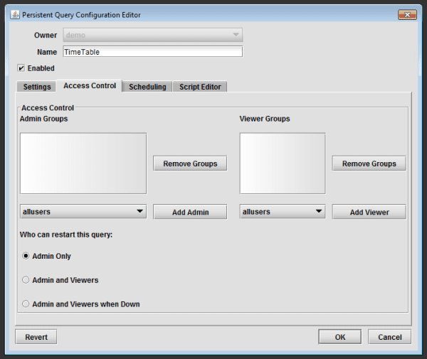 The Persistent Query Configuration Editor dialog allows query authors and other authorized users to make changes related to a specific persistent query. However, users who do not have the appopriate permissions will see a view-only dialog.