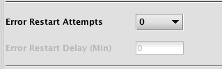 The "Error restart attempts" drop-down allows the query to automatically restart if it fails. An optional delay in minutes between restarts can be entered; if a query fails, the next restart attempt will be delayed by this time. The error count resets next time the query is started due to its scheduling, or 24 hours after the last failure.