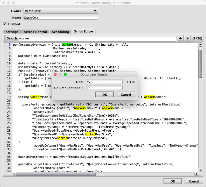You can use the Search field to find and highlight any term in the script editor. Simply enter the applicable term or phrase iand press Enter/Return on your keyboard. The arrows at the right of the search bar scroll through each highlighted term: a green highlight indicates the term currently selected, and the yellow highlight indicates other instances of that term in the script. The Script Editor includes line numbers along the left side. You can quickly jump to any line number using the Go to Line Number feature, which can be accessed by right-clicking within the Script Editor, or using the keyboard shortcut, Ctrl+G or ⌘+G (macOS). The line number where you have placed your cursor will turn from black to blue.