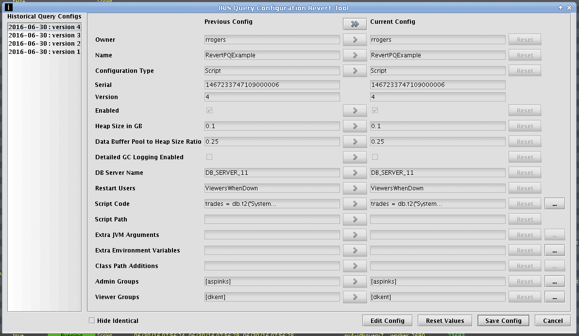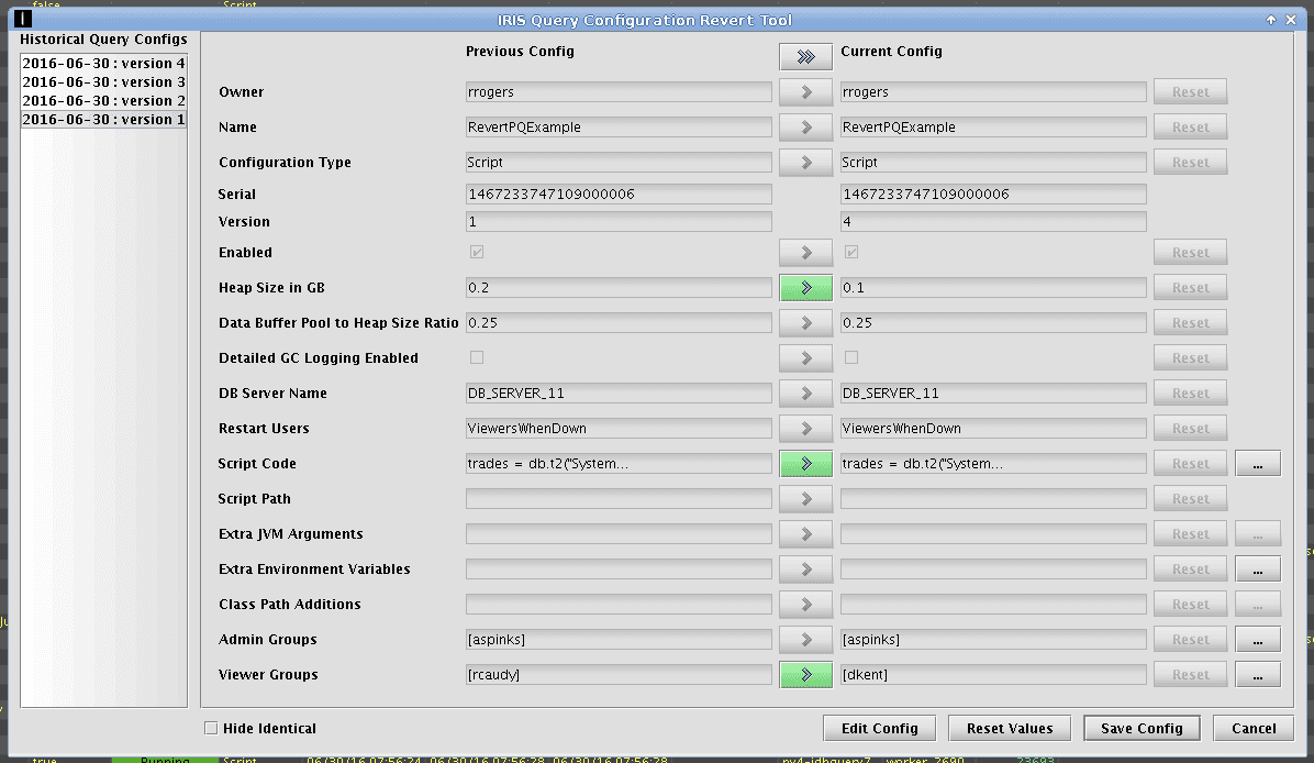 When possible, changes are noted in the parameter fields shown on the screen. In this example, the parameter for Heap Size changed from ".2" to ".1". Similarly, the parameter for Viewer Groups changed from "rcaudy" to "dkent".