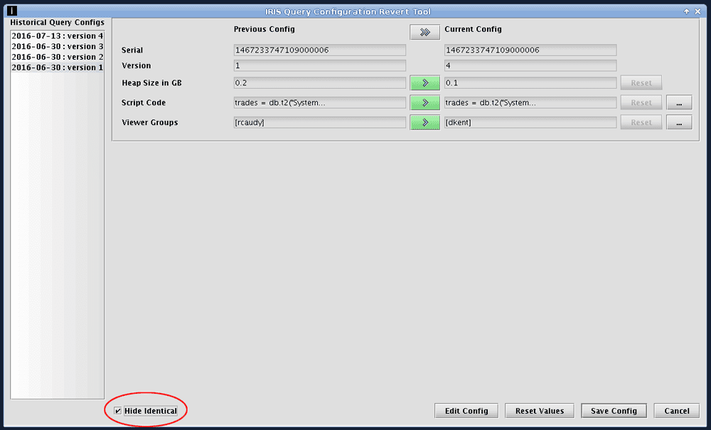 When "version 1" is selected from the list on the left, differences in parameters between the two versions will be highlighted by green buttons between the two columns. In this example, there are different parameters for Heap Size, Script Code, and Viewer Groups.