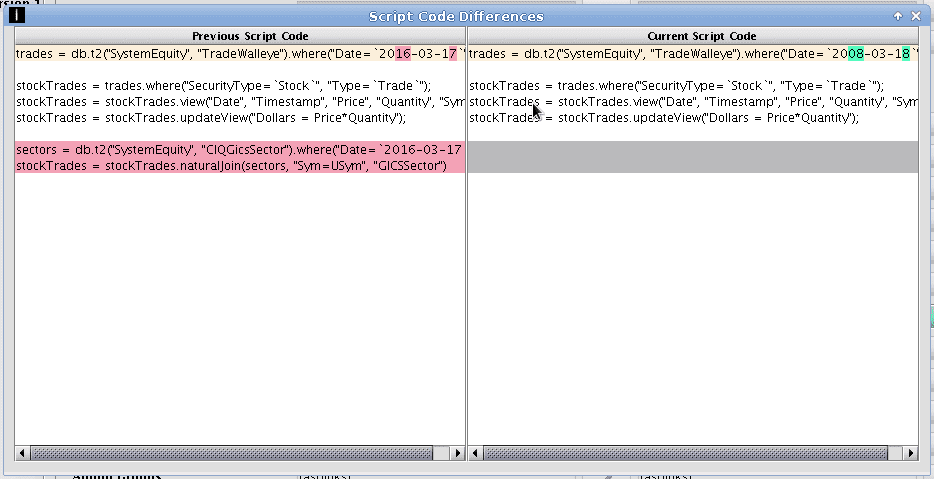 In this example, clicking the ellipses button to the right of the field Script Code opens the Script Code Differences window, which presents the previous script on the left and the current script on the right.