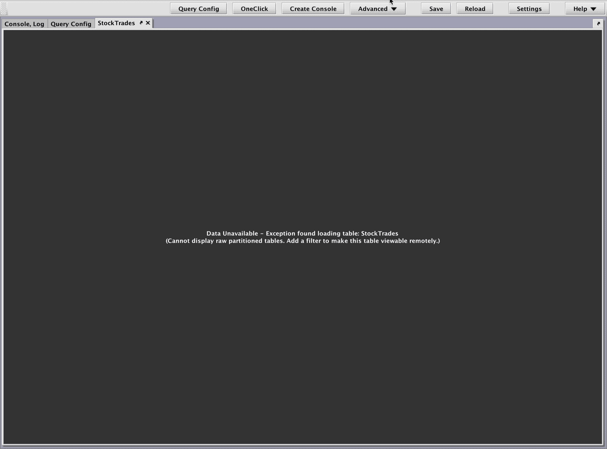 The console will not open a table that does not have one or more partitions specified. If we open the script editor, we will see that StockTrades=db.t("LearnDeephaven" , "StockTrades"). You must include a filter in the persistent query, such as either of the following: