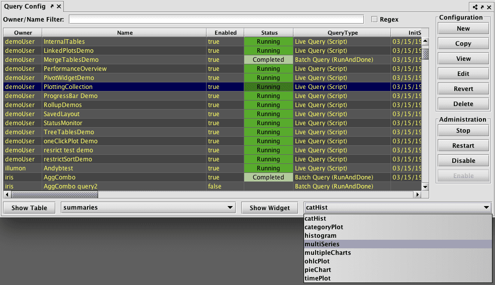To see a plot (widget) associated with a query, select the name of the query from the Query Configuration window. In the example shown below, "Demo-Plots" was highlighted by clicking anywhere in that row. To see the plot(s) associated with that query, click on the drop-down list to the right of the Show Widget button. This drop-down menu includes, in alphabetical order, the name of every plot associated with the highlighted query.