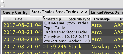 To see the name of the query server or work for any given table or plot in the Deephaven console, simply hover your cursor over the tab representing that specific item in the Deephaven console. The tooltip for that item will include the following items:
