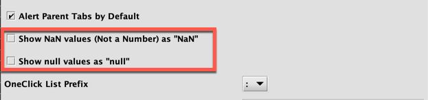 These settings determine how null values will display in your workspace. By default, null values will appear as blank cells. If Show NaN values (Not a number) as "Nan" is selected, null values will appear as Nan in your table. If Show null values as "null" is selected, null values will appears as (null) in your table.
