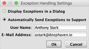 By default, when exceptions occur the relevant details will open in a dialog in the Deephaven console that must be dismissed. This setting allows you to choose whether or not to bypass the Exception Visualizer Dialog and automatically send exceptions to support. To enable this feature, click Exception Handling and select Automatically Send Exceptions to Support. A username and valid email address is required.