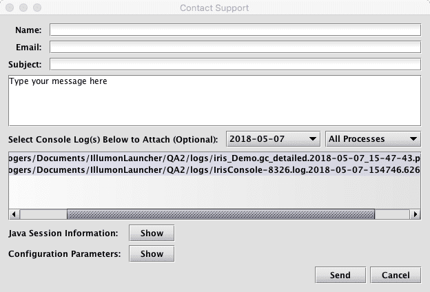 Selecting Contact Support will generate a support request with Deephaven Customer Support, and will present a dialog box similar to that shown below. It offers a convenient way for users to attach log files with their support requests, which, generally speaking, helps identify possible problems and expedite issue resolution.