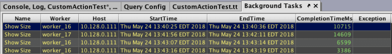 The Background Tasks panel shows Custom Actions that have been executed. As seen below, the panel logs the following information for the Custom Action: Name, Worker, Host, Start Time, End Time, Completion Time (in milliseconds), and any Exceptions if applicable.