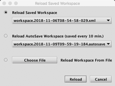 When Reload is clicked, a dialog box will allow the user to choose from manually saved workspace files, automatically saved workspace files, or to bring up a File Chooser to load any workspace file.