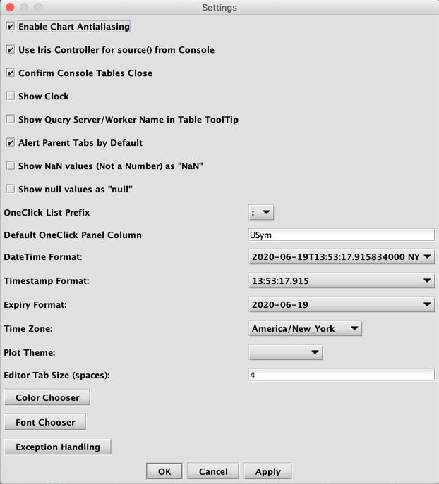 When checked, Enable Chart Antialiasing provides smoother lines and figures in charts. If you are running Deephaven over VNC or through Amazon Workspaces, you may want to turn antialiasing off. Otherwise, you should leave it turned on, which is the default setting.
