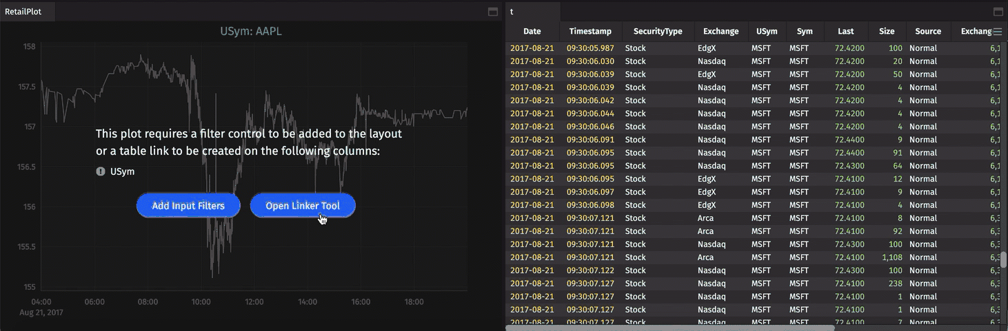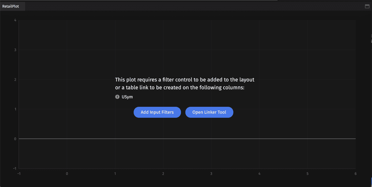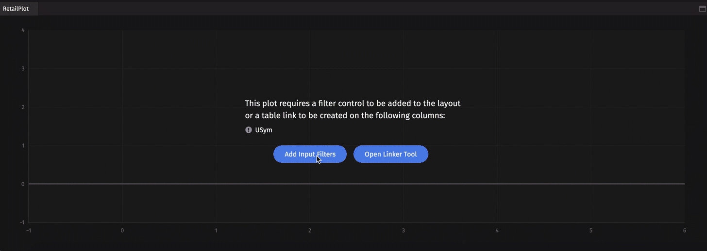 When retailPlot opens in the console, you will be prompted to "Add Input Filters" or "Use the Linker Tool" to filter the data in the appropriate column (in this case, "USym") before the plot will draw.