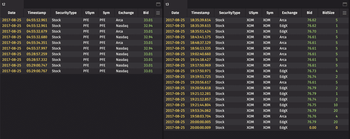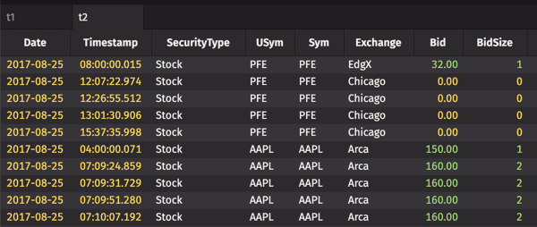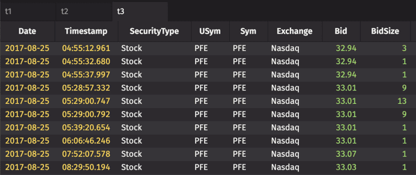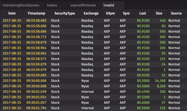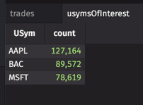 To demonstrate, we will create a "usymsOfInterest" table. If this were a ticking table, its contents could vary as it returns the first three distinct USyms at any given time. Then, we'll filter another table of stock data (that might include thousands of USyms), to only show the USyms that we care about — the ones in your "usymsOfInterest" table. We'll also create a table with the invalid results.