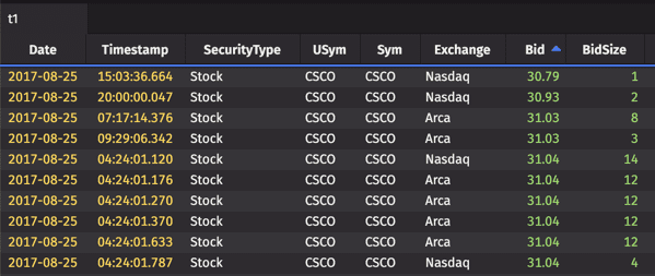 In this case, the filter returns rows only when the value in the Bid column is greater than 25, and the value in the Exchange column starts with the string N.