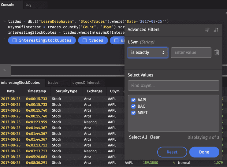 In the image below, we use the Advanced Filters dialog as a quick way to confirm "interestingStockQuotes" is limited to the three USyms in our "usymsOfInterest" table.