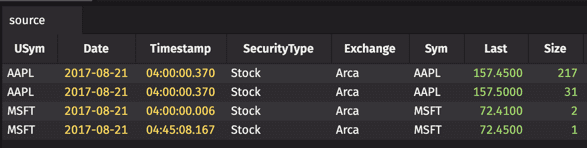 For this example, we'll create a simple table of 4 rows for 2 symbols from data in the StockTrades table: