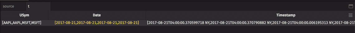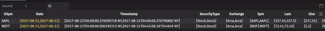 In the source table, there are two rows for each distinct USym, so there are two values in each array.