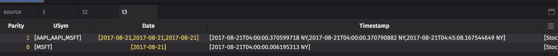 The values in the other columns are then evaluated for those moduli and then grouped into the corresponding arrays for each column. Therefore, the t3 table has only two rows of data - one for odd values and one for even values.