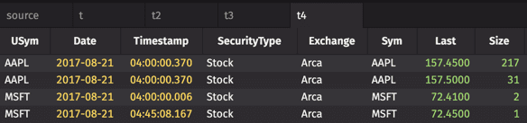 This is essentially equivalent to performing individual where filters for each unique value in the USym column, and then saving the results of each to its own variable. However, using the byExternal method is far more efficient and faster because it eliminates the need to repeatedly pass over the data for each of the values of interest.