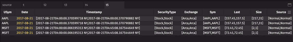 You can also create a TableMap using more than one column in the table. In this case, the number of tables created would be based on the number of all possible combinations of key-pairs in the TableMap. For example, let's include the Date and Exchange columns in our query. The StockTrades table holds data for five different dates. Each key-pair for the Date column would be paired with each key-pair for the Exchange column. Note: if we were using all the table data, that would be 50 different tables; however, we've limited the rows in "source2" using the headBy method and filtered to three Exchange values.