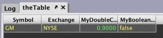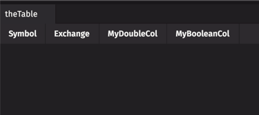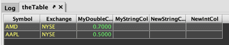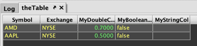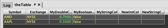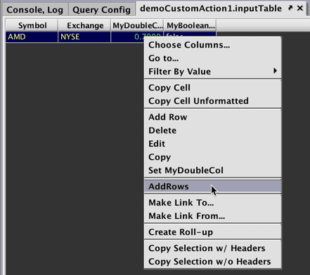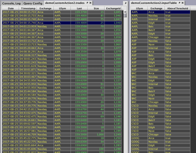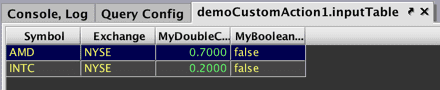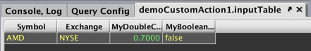 CustomActionTableand its associatedinputTableObjectare created in the InputTableTest namespace. This table will include two key columns, USym and Exchange, and one value column, AboveThreshold, that will show either "true" or "false". - The fifth line of the query creates inputTable in the console.