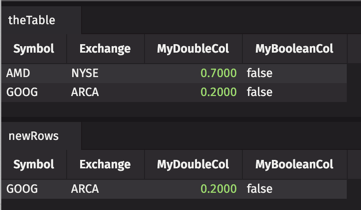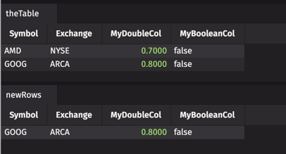 Remember that key column values must be distinct. If we add a new row for the Symbol GOOG, on the same exchange (ARCA), the new information in the value columns will actually replace the current GOOG row: