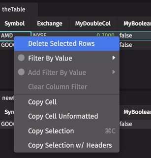 After running the persistent query, select the rows you wish to delete from the Input Table and secondary-click within the table data. The context menu now includes DeleteRows: