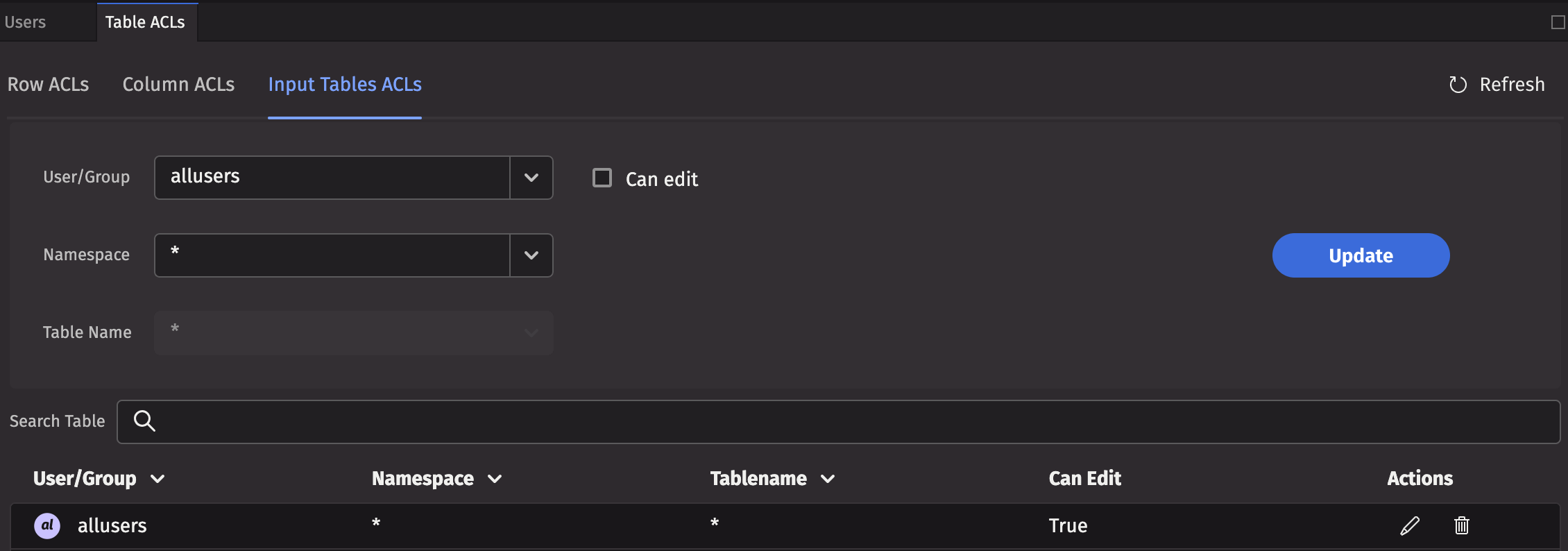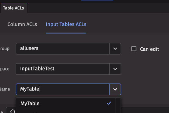 Navigate to the Table ACLs tab, then Input Tables ACLs.