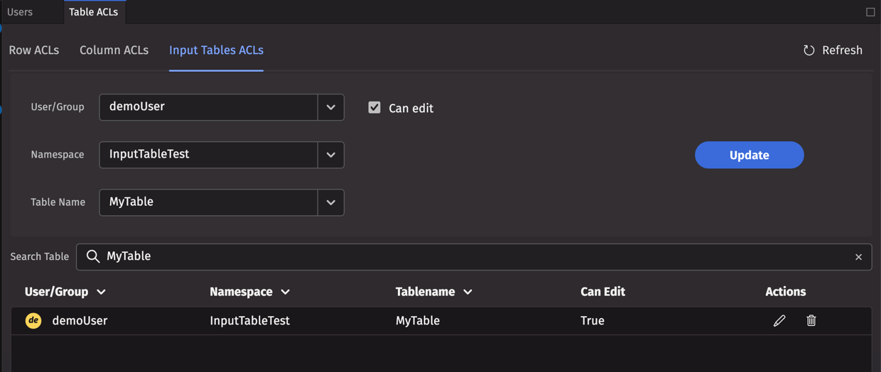 - To read an input table, ensure the user has access to the table via standard mechanisms, configurable in Table ACLs -> Row ACLs.