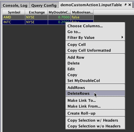 A Custom Action is a block of custom code (a Groovy closure) that can be run from a table's context menu. Because Custom Action code runs in the Deephaven console, it is aware of the rows the user has selected, and can prompt for additional inputs. This is especially useful for updating Input Tables where combining the user's selection, the user's input, and query data allows sophisticated settings and calculations stored in Input Tables to be easily adjusted on the fly. The values in the Input Table, in turn, can drive further analyses.