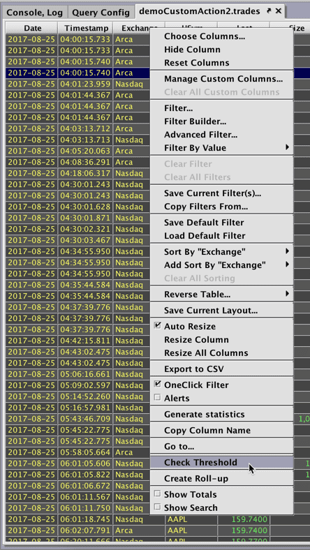 The Custom Action Check Threshold is available in the secondary-click column header menu for the trades table: