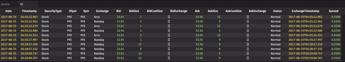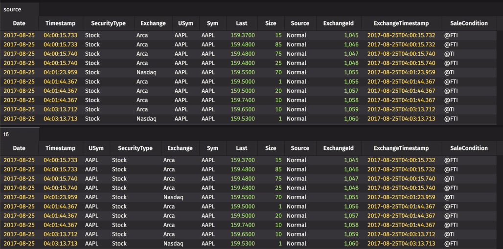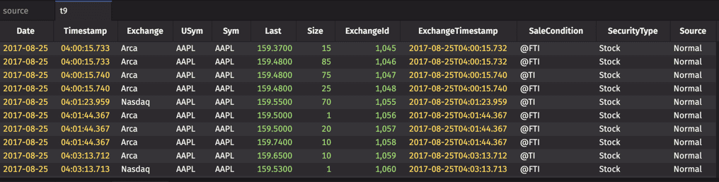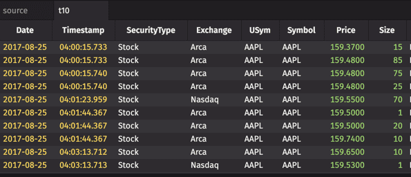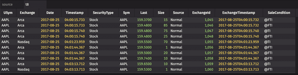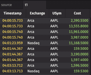 The first three arguments indicate that table "t1" should include the Timestamp, Exchange and USym columns from the source table, with no change. The third argument, "Cost=Last*Size", indicates that a new column should be created in "t1" that includes the result from the specified calculation.