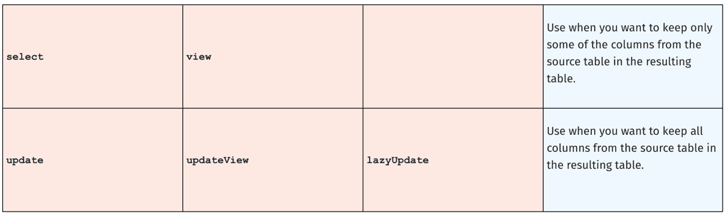 Once you have your initial column set pared down, you may want to modify a column or add more columns to the resulting table. This is when the update, updateView, and lazyUpdate methods come into play. When using one of these three selection methods, all of the columns from the source table are automatically included in the resulting table.