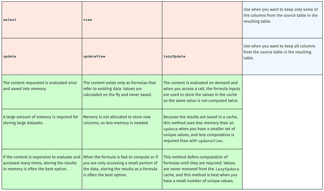 The lazyUpdate method computes column formulas on demand and will defer computation until it is required. Because it caches the results for the set of input values, the same value will never be computed twice. For small sets of unique values, this uses less memory than an update, and requires less computation than an updateView. However, if you have many unique values, an update will be more efficient because the lazyUpdate stores the formula inputs and result in a map, whereas the update stores the values more compactly in an array.