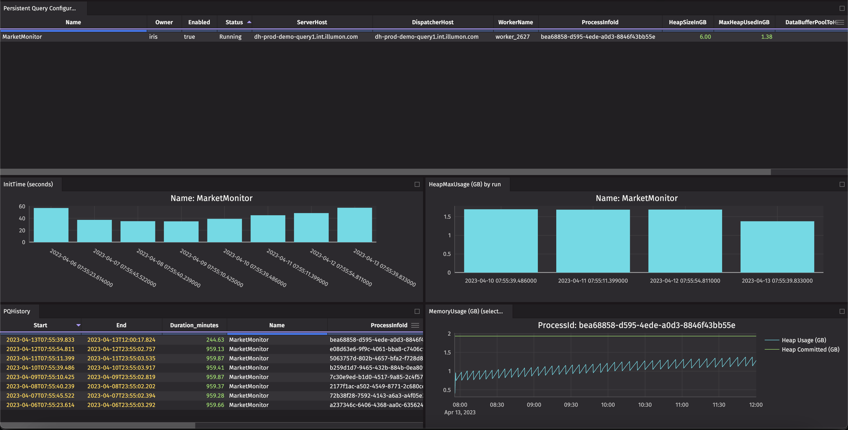 This example creates a dashboard that includes graphs of initialization times as well as heap usage over the last seven days of a specific PQ, then graphs the heap usage throughout the day of a single run.