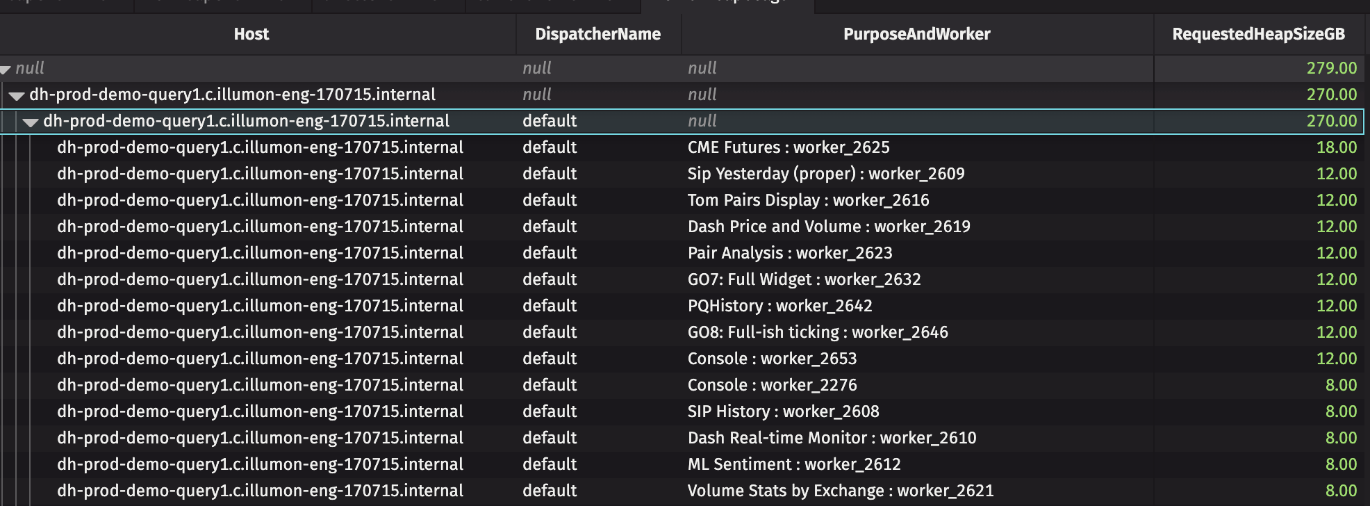 This example creates a dashboard that includes the heap usage of all PQs and breaks it down by server. This is particularly prudent for load balancing in a Deephaven cluster. It also shows all current workers and their server hosts, heap allocation, and PQ name (if applicable).