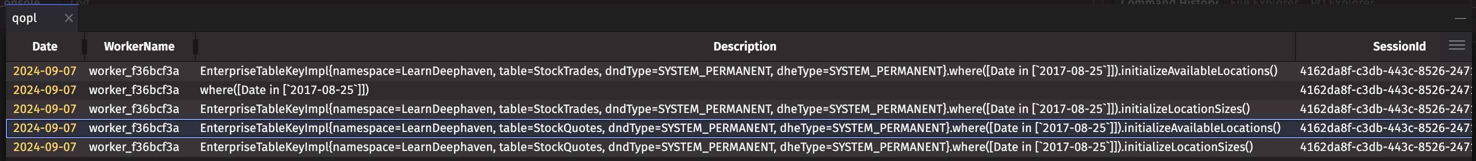 The image below shows a snippet of the Description column from the Query Operation Performance Log, where you can see logs related to PQs that open the StockTrades and StockQuotes tables from the LearnDeephaven namespace:
