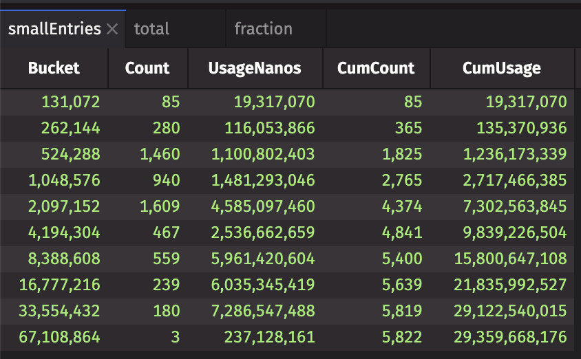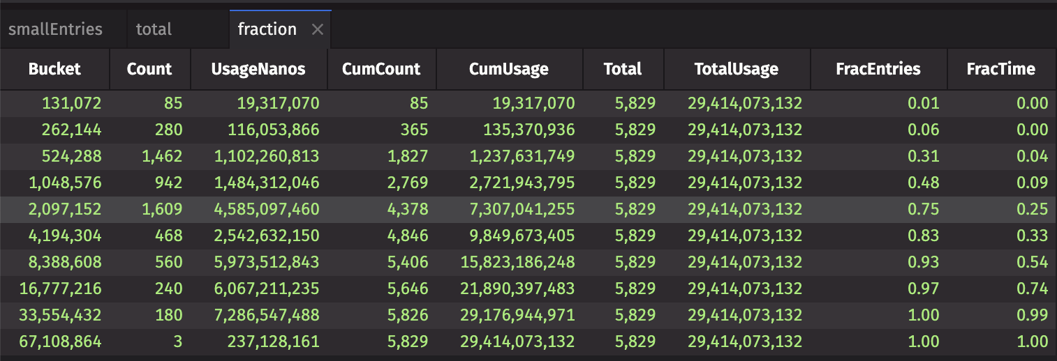 The fraction table contains the fraction of entries and time for each bucket of usage: