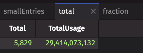 The following query creates three tables with specific totals and usage information to see just how many small entries exist in your system: