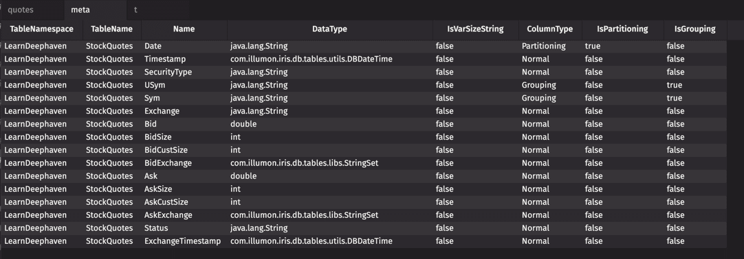 The document's screenshot and code examples use db.t, DBDateTime date times, and getMeta, but the concepts also apply to Core+ and db.historicalTable, Instant date times, and meta.