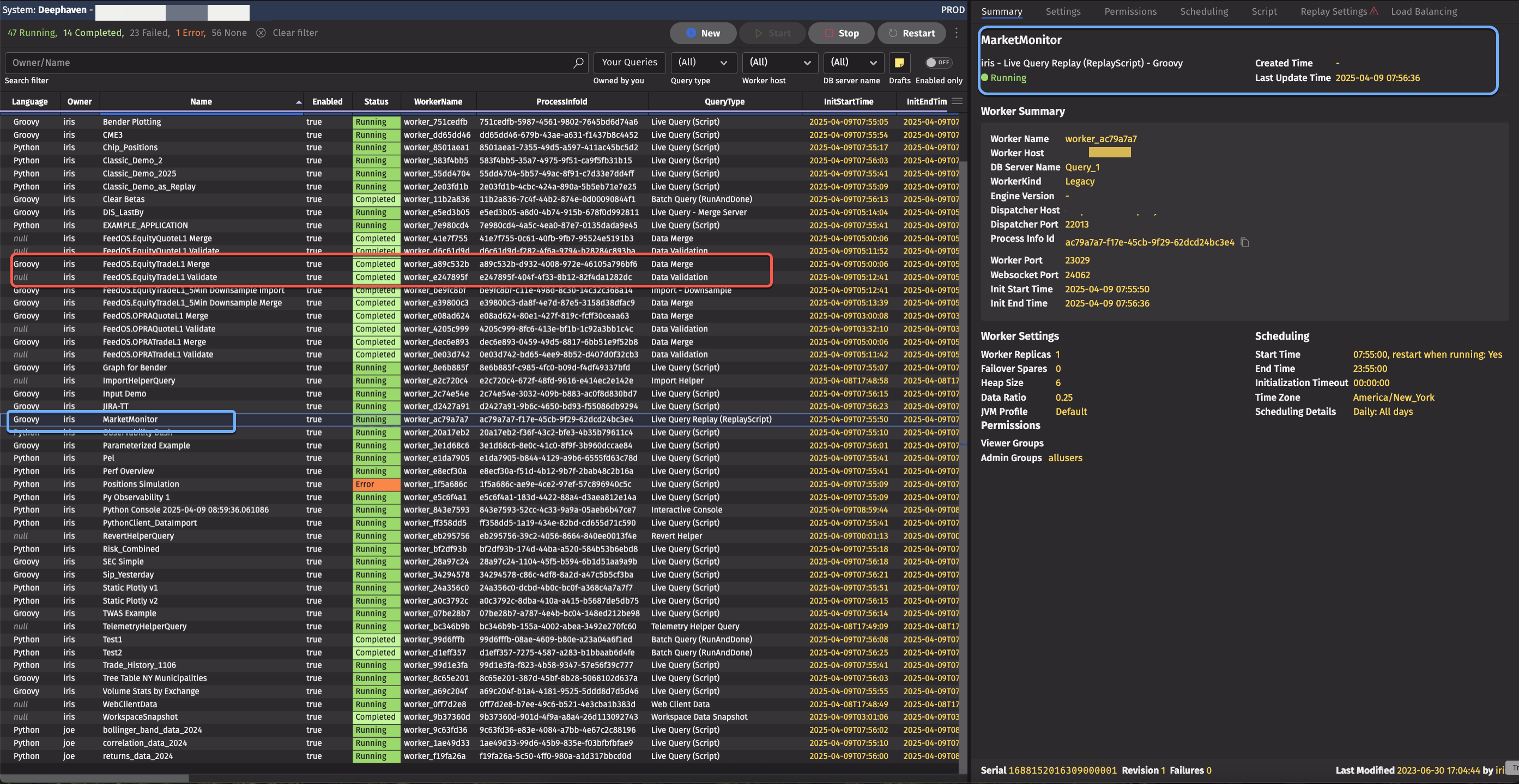 The example Query Monitor above lists various jobs, with different names and statuses (Running, Completed, Error, etc.). The worker’s ID and query types are also displayed. Clicking on specific entries in the query monitor expand the view to include detailed information about settings, staus, and more.