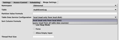 When "Data Merge" is selected as the Configuration Type in the Persistent Query Configuration Editor, the Merge Settings tab becomes available. This tab includes a drop-down list for Table Data Service Configuration.