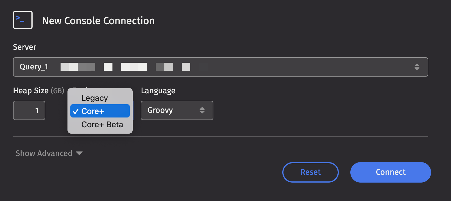 When selecting the engine (Legacy, Core+, or Core+ Beta) in a Code Studio, a property controls the display order for each worker kind. Lower values are displayed first by the Code Studio drop-down. The Legacy engine is hardcoded to 100. Core+ workers default to 200, but in the default v1.20230511 (Vermilion) and later iris-environment.prop, they are set to 50 with the property WorkerKind.DeephavenCommunity.displayOrder. As a result, new installations display Core+ first, but installations initially created with releases before Vermilion display Legacy first.