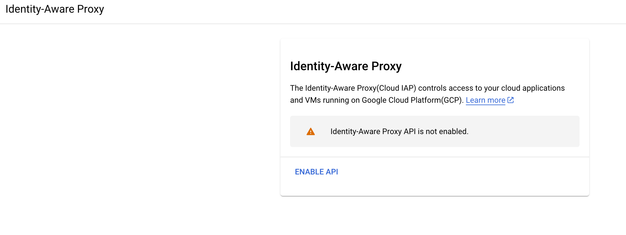 Enable IAP API for the project Navigate to Identity-Aware Proxy in Google Cloud Console or search "IAP" in the GCE console bar to access the page to enable IAP for your current project.