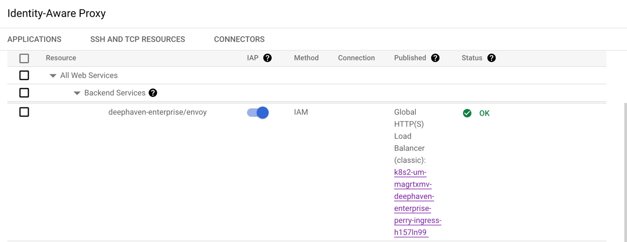 After applying these configurations, you should see the backend service in the IAP page ("deephaven-enterprise/envoy" in the example).