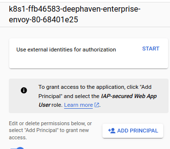 - In the right-hand side menu, click Add Prinicipal This allows you to add a user for a specific IAP application rather than all IAP applications (which is what you get when granting through regular IAM permissions).