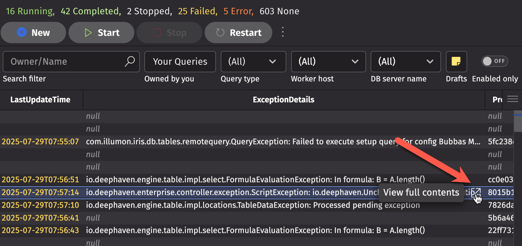 When a persistent query fails with a Java exception, you can view the exception message and stack trace in the Deephaven console.